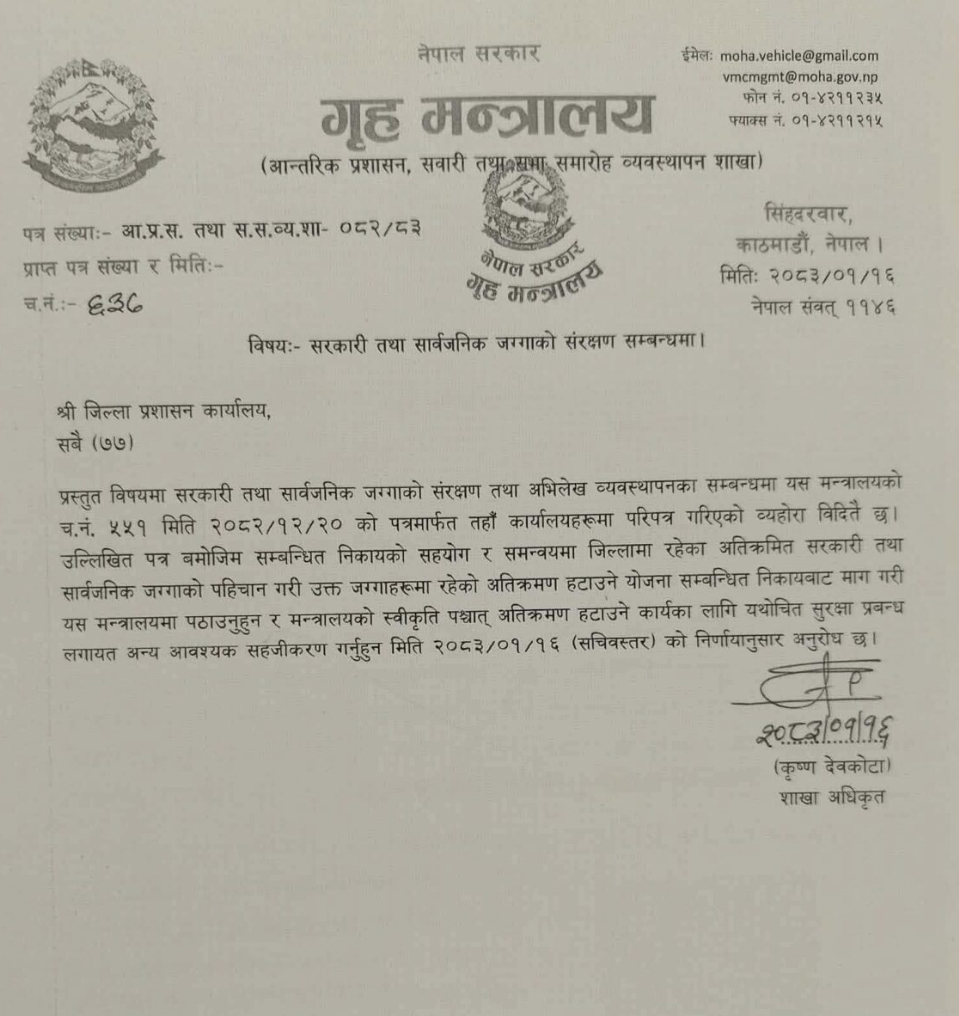 गृह मन्त्रालयले सचिवस्तरीय निर्णय गर्दै यस सम्बन्धमा सबै जिल्ला प्रशासन कार्यालयहरूलाई पुनः परिपत्र जारी गरेको हो। यसअघि २०८२ चैत २० गते जारी गरिएको निर्देशनलाई स्मरण गराउँदै मन्त्रालयले अतिक्रमित जग्गाको पहिचान, संरक्षण र फिर्ता प्रक्रियालाई प्रभावकारी बनाउन आग्रह गरेको छ।